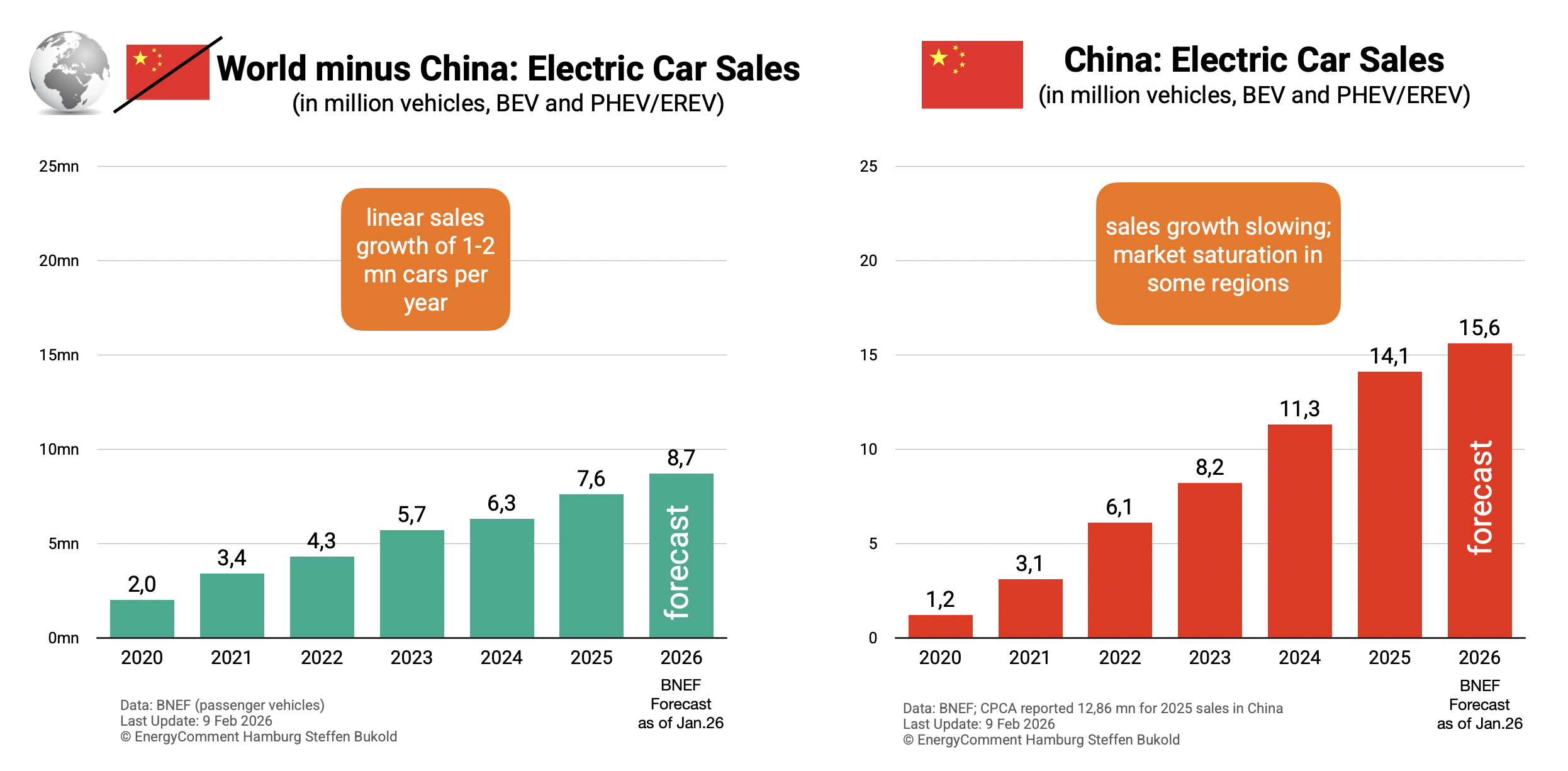 Within a few years, China will cease to function as the driving force of car electrification, as more and more regions approach market saturation. The EV market share in China has already exceeded the 50% threshold. With financial support being scaled back, 2026 sales are expected to grow by only approximately 10% to 15.6 million electric cars.