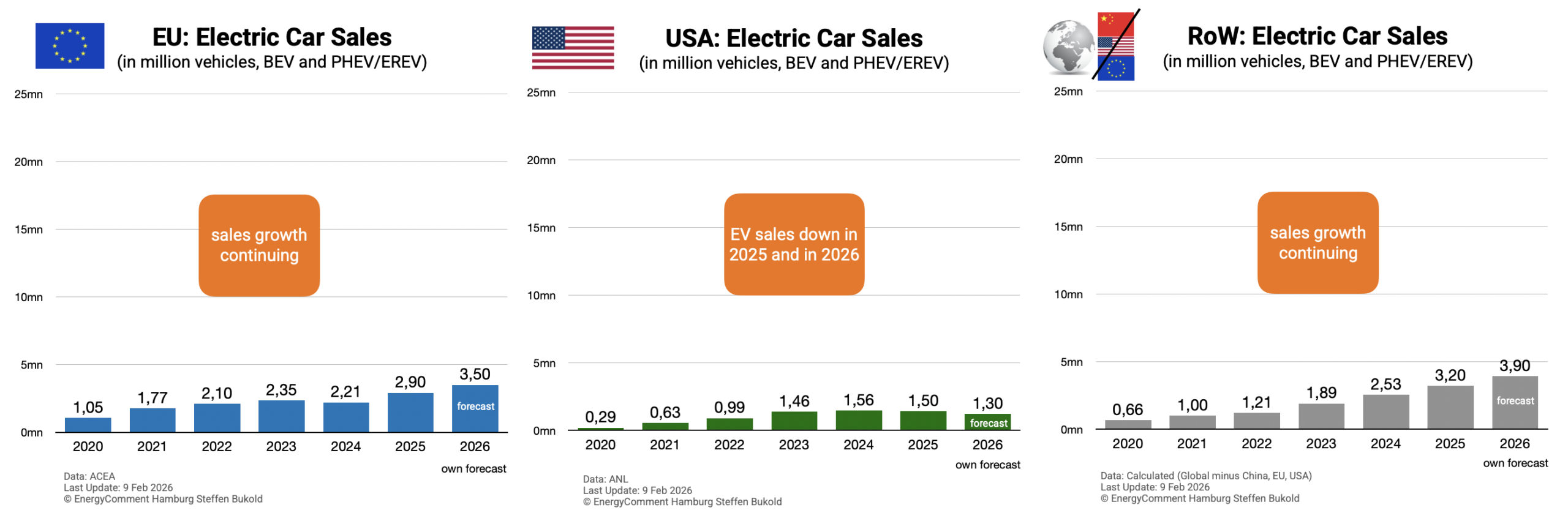 2026: Growth is expected to moderate in the current year. The market share could climb to 28%. Currently, an increase of approximately 2.6 million EVs is anticipated. This slowdown is primarily attributable to a politically driven collapse in US sales and a market cooling in China following the expiration of subsidies and scrappage schemes.