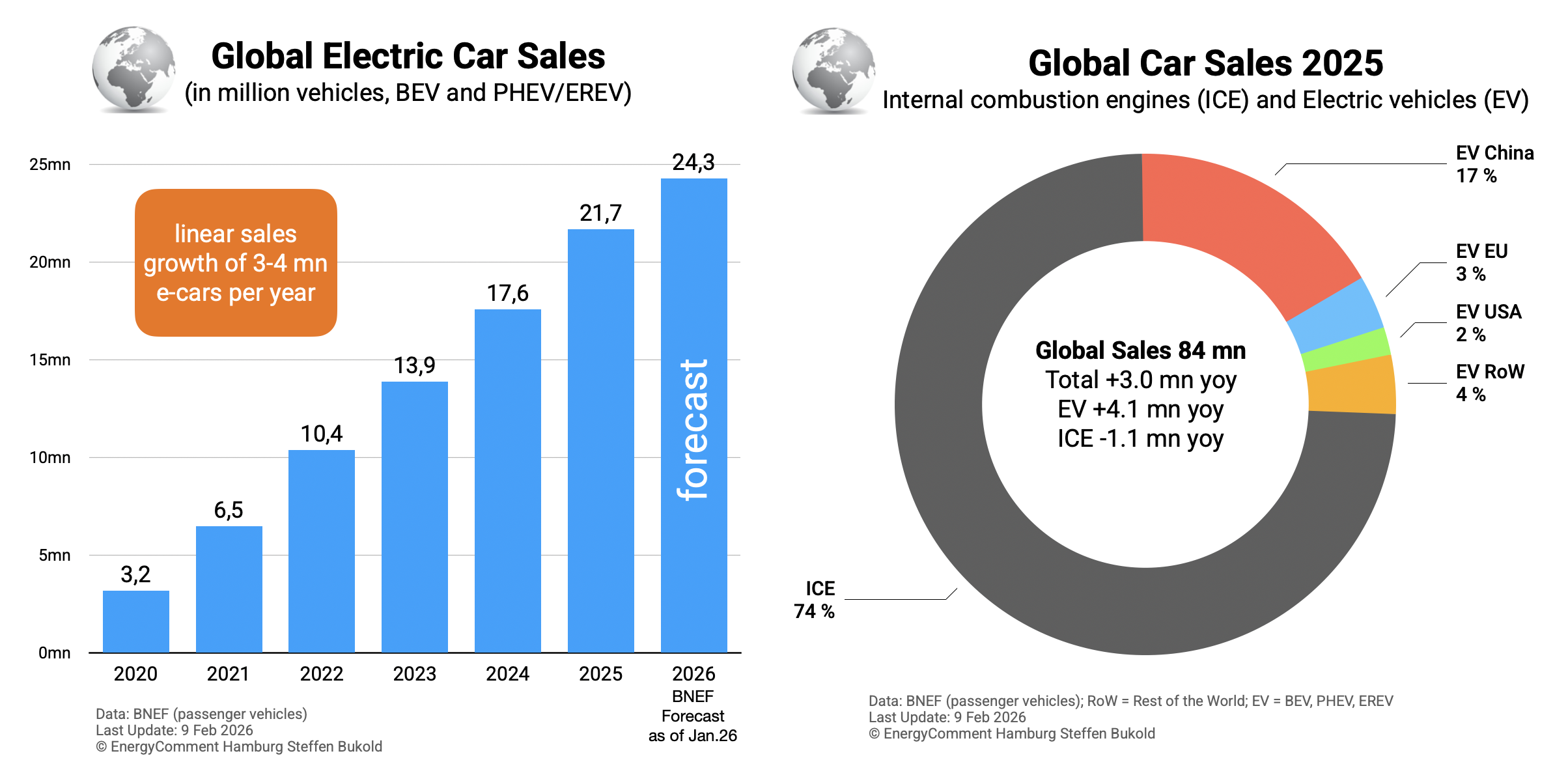 The EV share of the global automotive market rose to 26% in 2025. Nearly two-thirds hereof (17%) occurred in China.