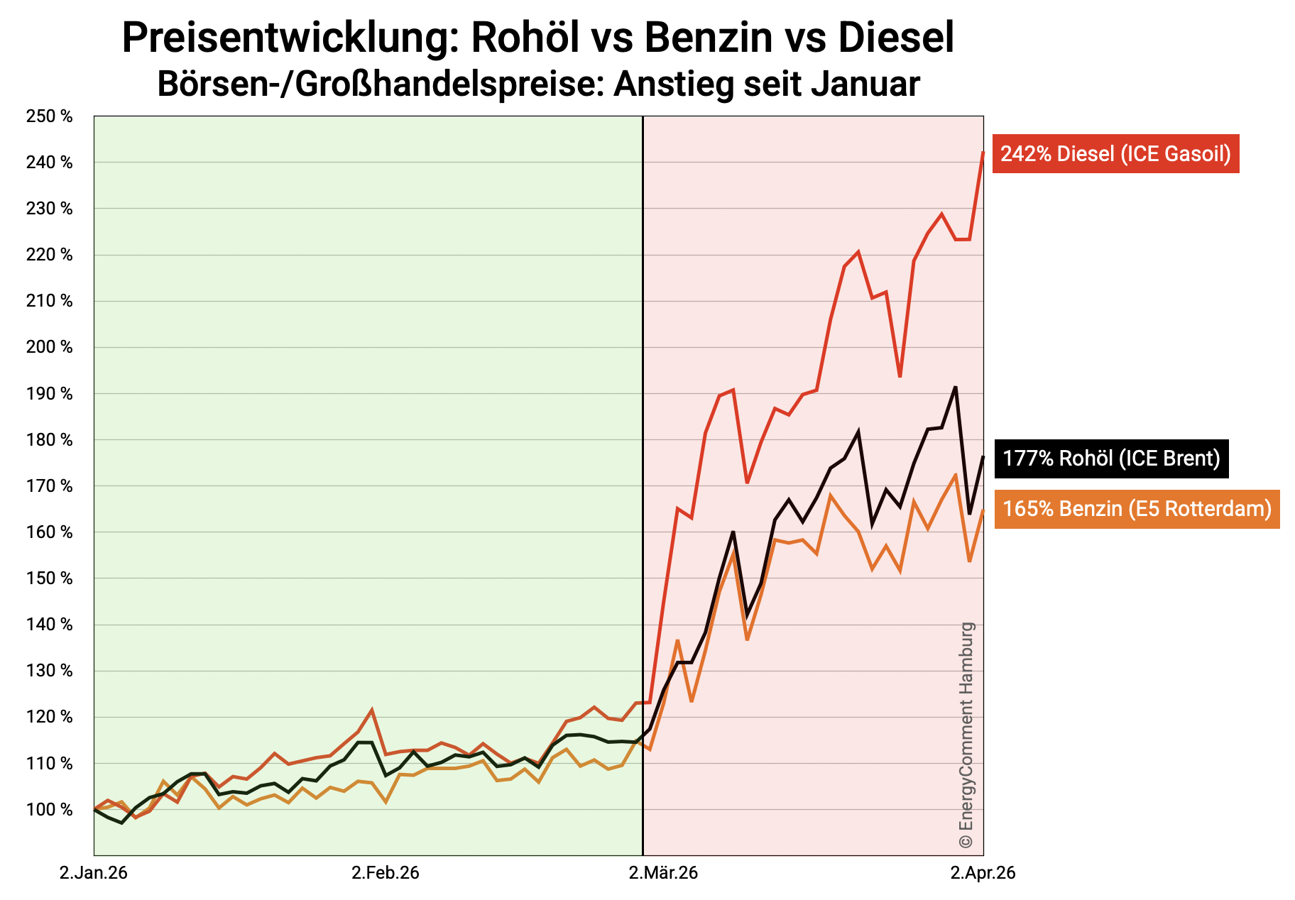 Bis Kriegsbeginn am 28. Februar liegen die Preise noch relativ eng zusammen. Doch in den ersten fünf Kriegswochen bis zum 2. April hat sich Diesel steil nach oben abgesetzt. Enorme 142% legte Diesel seit Anfang Januar zu (von 100% auf 242%), während Benzin 65% teurer wurde und damit nicht mit dem Preisanstieg von Rohöl (+77%) Schritt halten konnte.