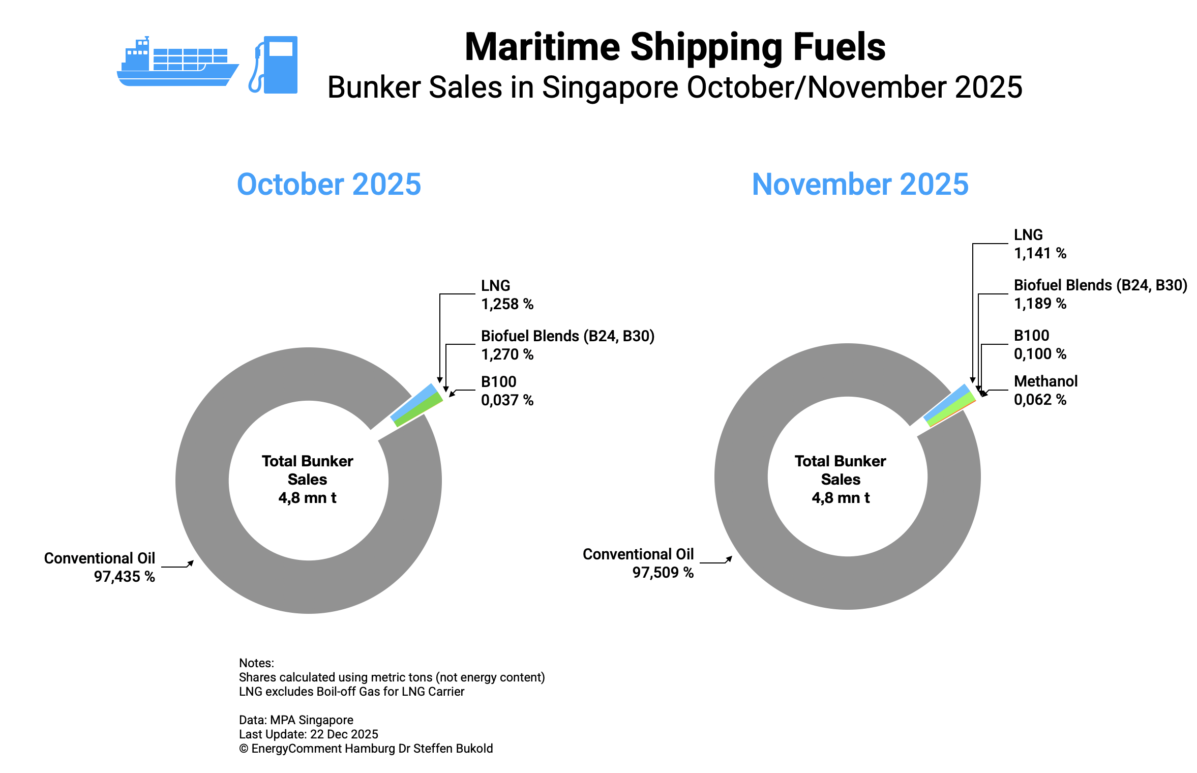 Since 2025, Singapore has also recorded bunker sales of pure biofuels (B100), though these remain very small at 0.03% of total fuel volumes.