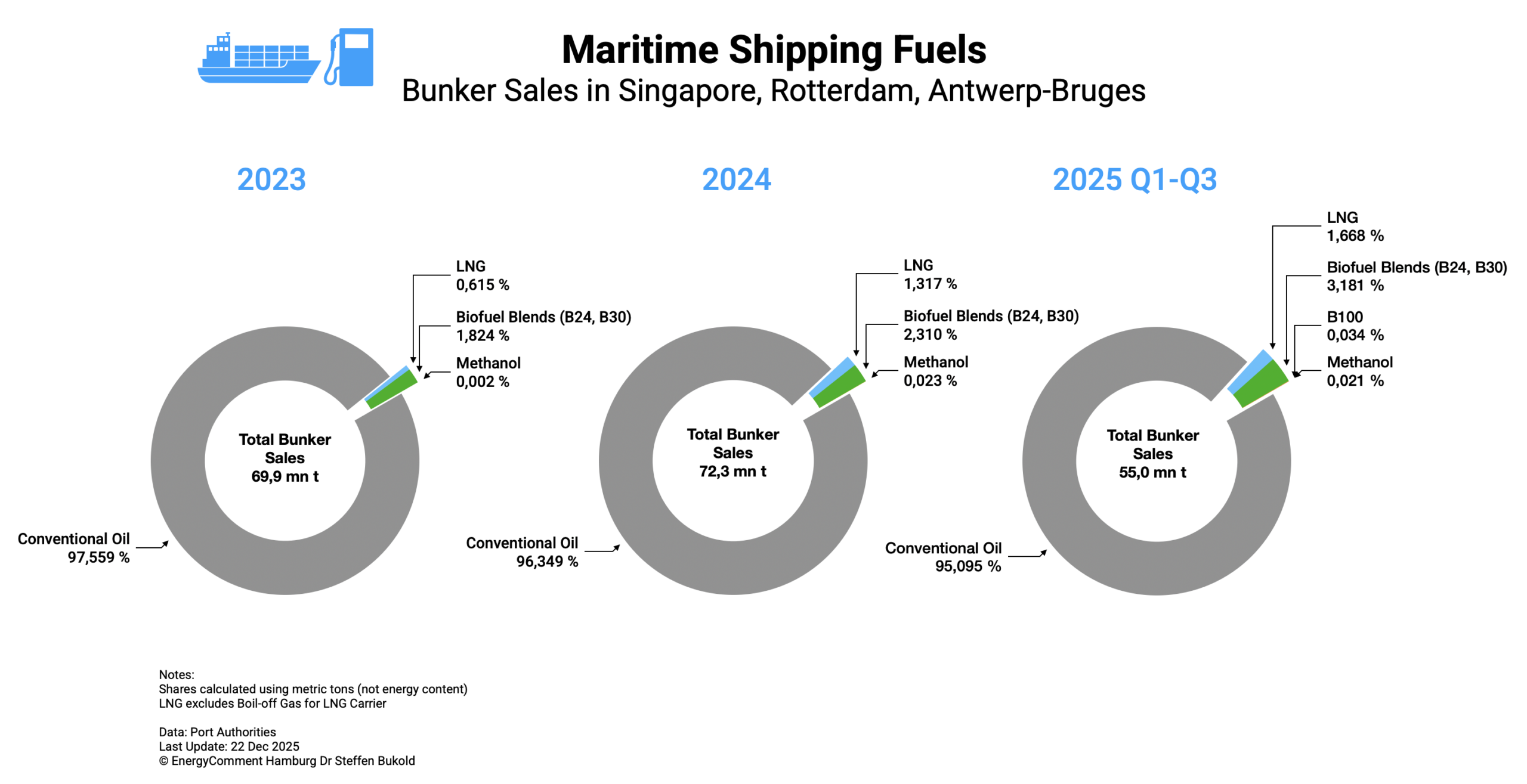 This shift is not synonymous with decarbonization as the share of fossil natural gas (LNG) rose from 0.6% (2023) to 1.7% (2025) of bunker sales.